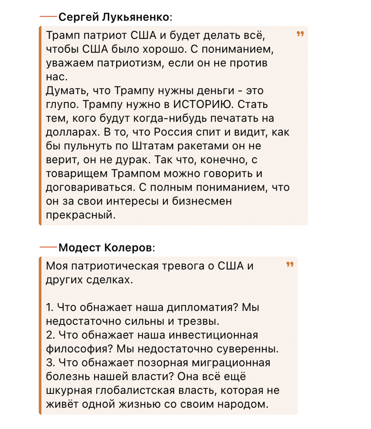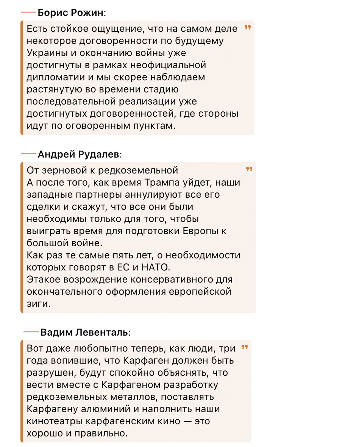 Среди Z-блогеров предложение Путина отдать российские ископаемые Вашингтону раскритиковали. Против него мягко высказался и полпред Путина на Урале Артем Жога. Путина же, по мнению научного сотрудника Европейского совета по международным отношениям Агате Демаре в колонке для Politico, к переговорам вынудил грядущий дефицит бюджетных денег и их нехватка на ведение войны.