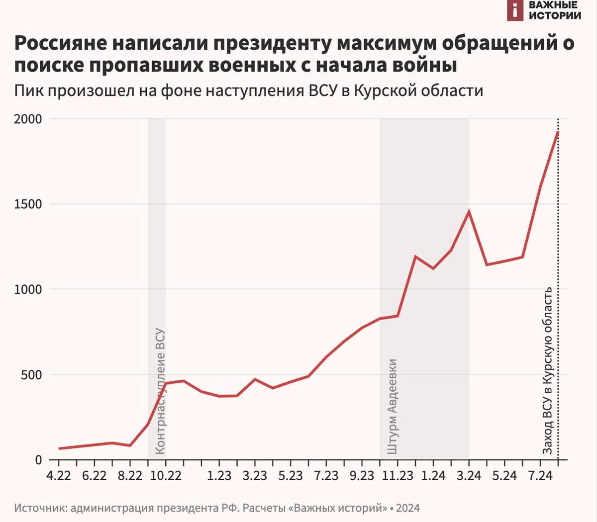 По данным «Важных историй», в августе 2024 года, на фоне наступления ВСУ в Курской области, россияне отправили президенту рекордное число обращений о поиске пропавших без вести военных — почти 2 тыс. (1927). Всего с начала полномасштабной войны в Украине в феврале 2022 года и до сентября 2024 года администрация президента получила более 20 тыс. жалоб по этой теме.