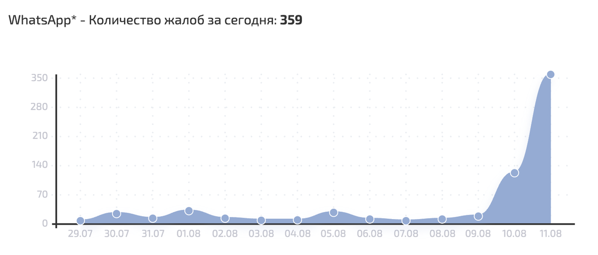 Согласно данным сервисов «Сбой.рф» и Downdetector, число жалоб на WhatsApp в несколько раз увеличилось за последние сутки — от 103 в воскресенье, 10 августа, до 359 в понедельник, 11 августа. На «Телеграм» вчера за весь день пожаловались 211 раз, сегодня до обеда — уже 161. В обоих мессенджерах начиная с утра понедельника число обращений пользователей резко возросло.