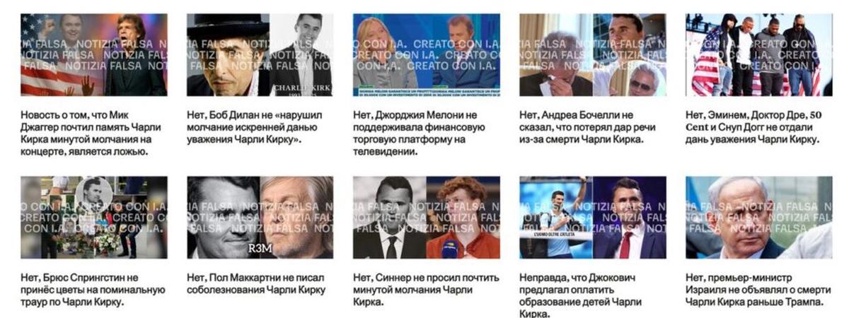 После убийства Кирка соболезнования его родственникам выразили не только политические единомышленники активиста — посты в память о нем опубликовали актер и политик Арнольд Шварценеггер, актеры Крис Прэтт, Роб Шнайдер и Джош Дюамель, телеведущий Джимми Киммел и другие звезды. Однако настоящих постов со словами скорби кому-то, очевидно, показалось мало. В сети начали распространяться многочисленные новости о знаменитостях, которые якобы скорбят по Чарли Кирку, причем появились они не только в США, но и в других странах, в частности очень широко в Италии.