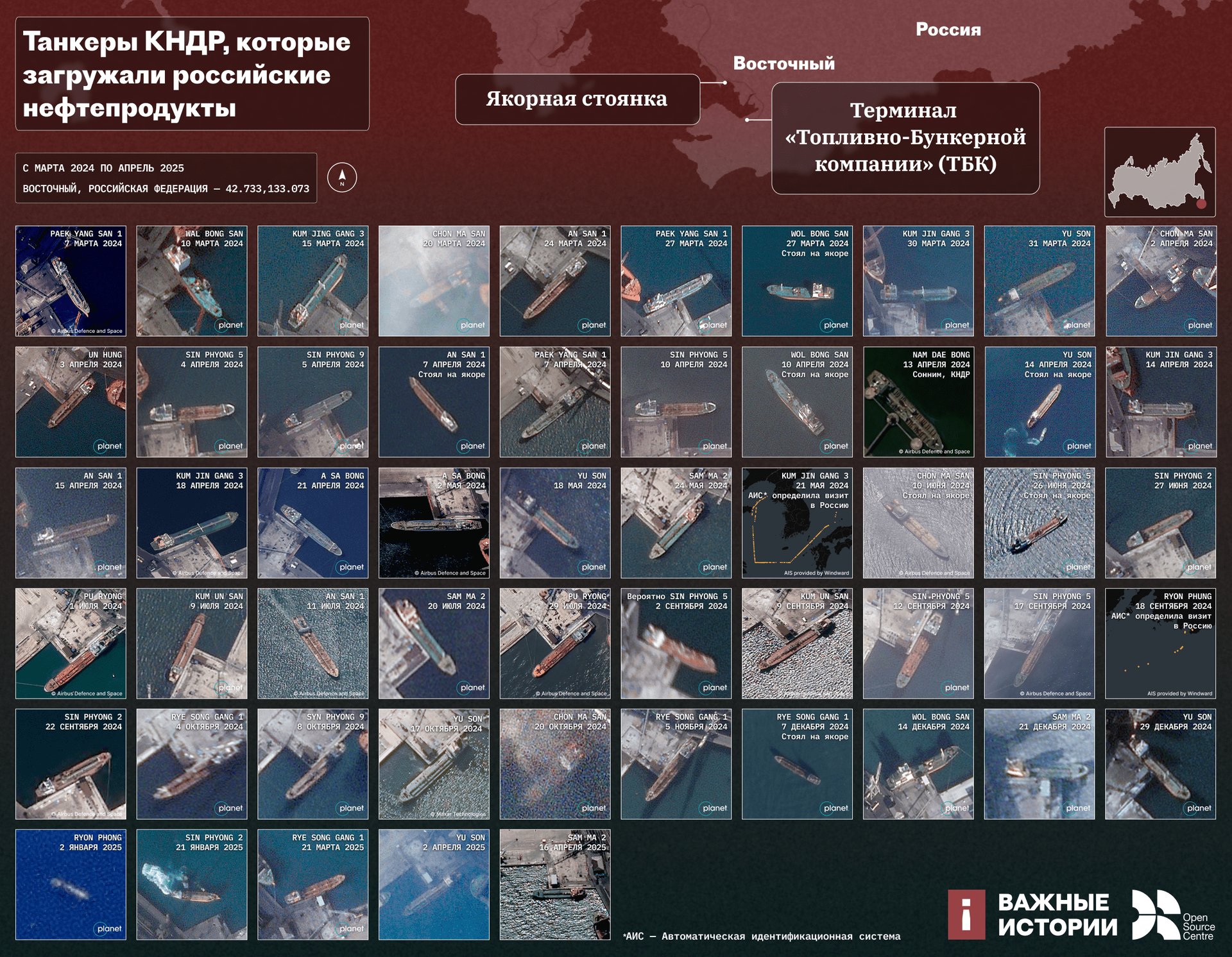В 2024 году начиная с марта некоммерческая организация Open Source Centre, партнер «Важных историй» по этому расследованию, обнаружила как минимум 50 танкеров, которые заходили в Находку пустыми, а потом, заполненные нефтью, отправлялись в КНДР — до северокорейского берега всего две сотни километров по прямой. Объем в 1,3 млн баррелей был рассчитан на основе вместимости танкеров, замеченных на спутниковых снимках — при условии, что танкеры загружали хотя бы на 90%.
