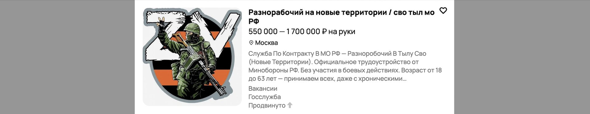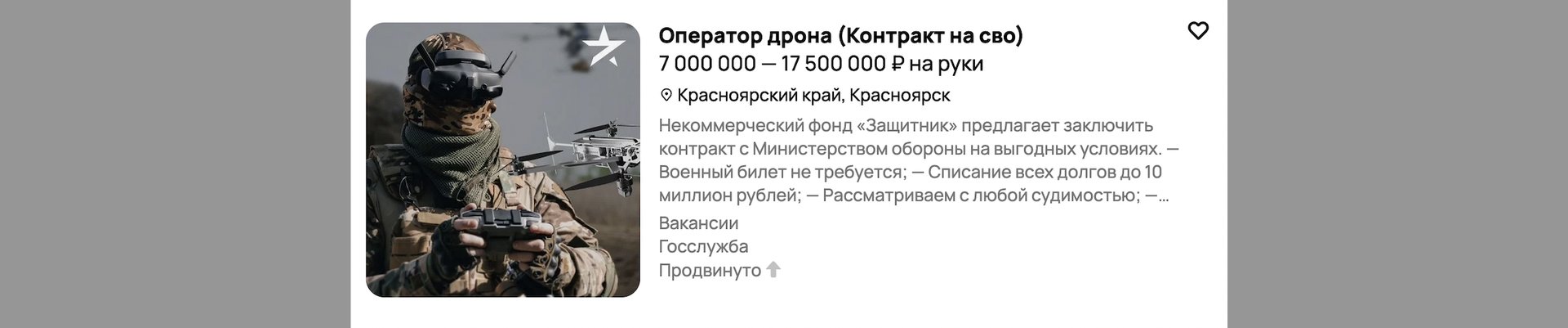 «Без опыта не берем. Ecли бeз опыта, у вac должны быть люди, готовые пойти нa CВО», — так звучит одно из требований к кандидатам на вакансию «рекрутер СВО» на «Авито». Таких рекрутеров ищут компании, набирающие людей на контракт с Минобороны России.